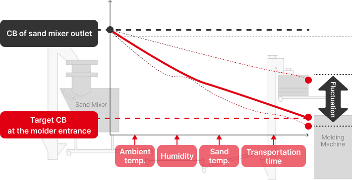 Sand properties change during transportation from mixer to molding machine by External Factor; such as Ambient temperature, Humidity, Sand temperature, Lapsed time, etc.