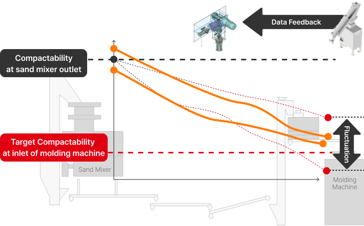Sand properties change during transportation from mixer to molding machine by External Factor; such as Ambient temperature, Humidity, Sand temperature, Lapsed time, etc.